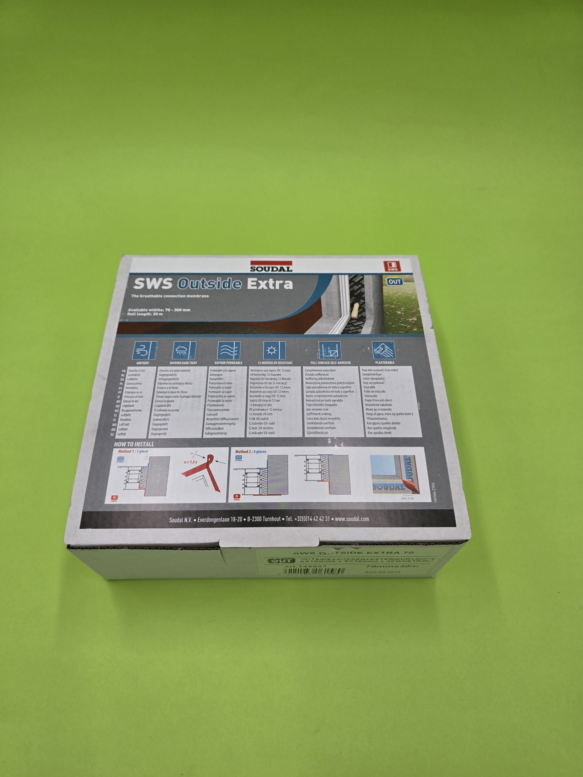 A SWS Outside Extra egy tömítő, páraáteresztő és esőálló szalag külső ajtó- és ablakszélek szigetelésére, erős öntapadó szalaggal az ablakkerethez való rögzítéshez.